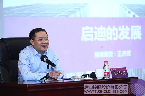 現場,王濟武董事長以“啟迪的發展”為題授課。他從啟迪“三葉花”標識的源起,講解了啟迪控股如何在不斷的發展中逐漸形成“政府、大學、企業”,“園區、產業、金融”,“資本、技術、產業”的立體三螺旋發展模式,講述了啟迪控股如何在探索中堅持“用科技服務、為科技服務”。他強調,啟迪控股內部要把“板塊力量”和“線條力量”結合起來,發揮集群式創新優勢促進未來大發展。