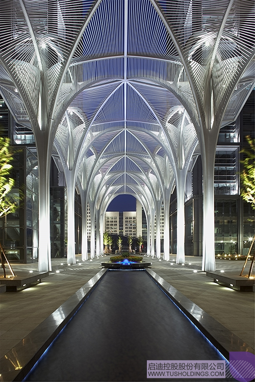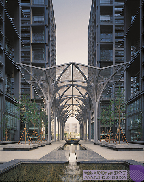 分列的四塔間隙為城市道路通向園區(qū)中心綠地打開了一條綠色通廊,中心是12顆參天鋼樹,形成灰空間的限定,與二層平臺自然的樹木共同營造出積極的公共交往空間。“樹影婆娑”下是綠意盎然的休閑廣場,展現(xiàn)人與自然共生共融的景象。建筑首層斜插入地下的草坪,標(biāo)準(zhǔn)層四角的綠色陽臺和頂層白色膜傘的屋頂花園無不體現(xiàn)了人性化、生態(tài)化的現(xiàn)代商務(wù)辦公理念。